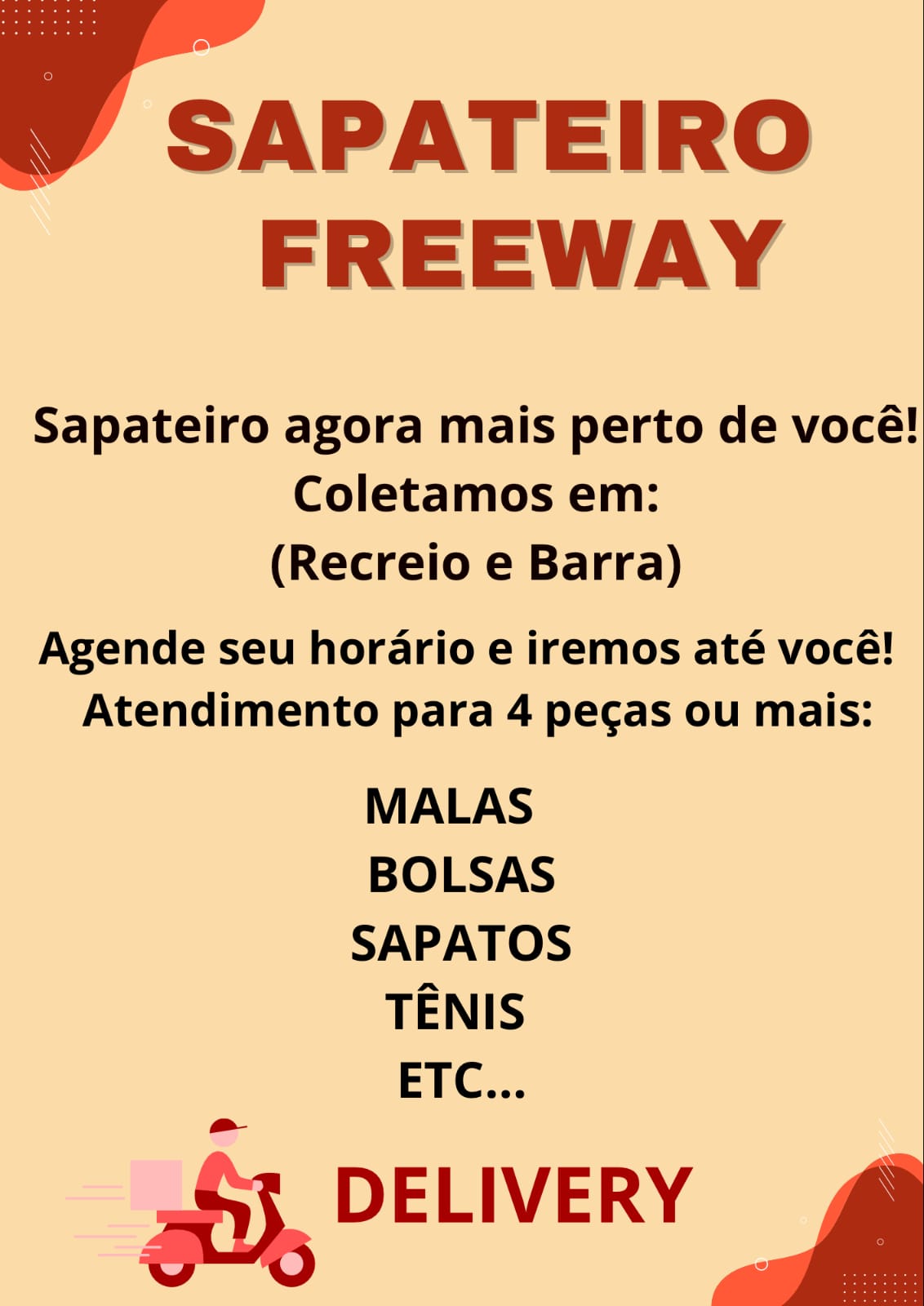 Sapateiro agora mais perto de você. Coletas feitas na Barra e Recreio.